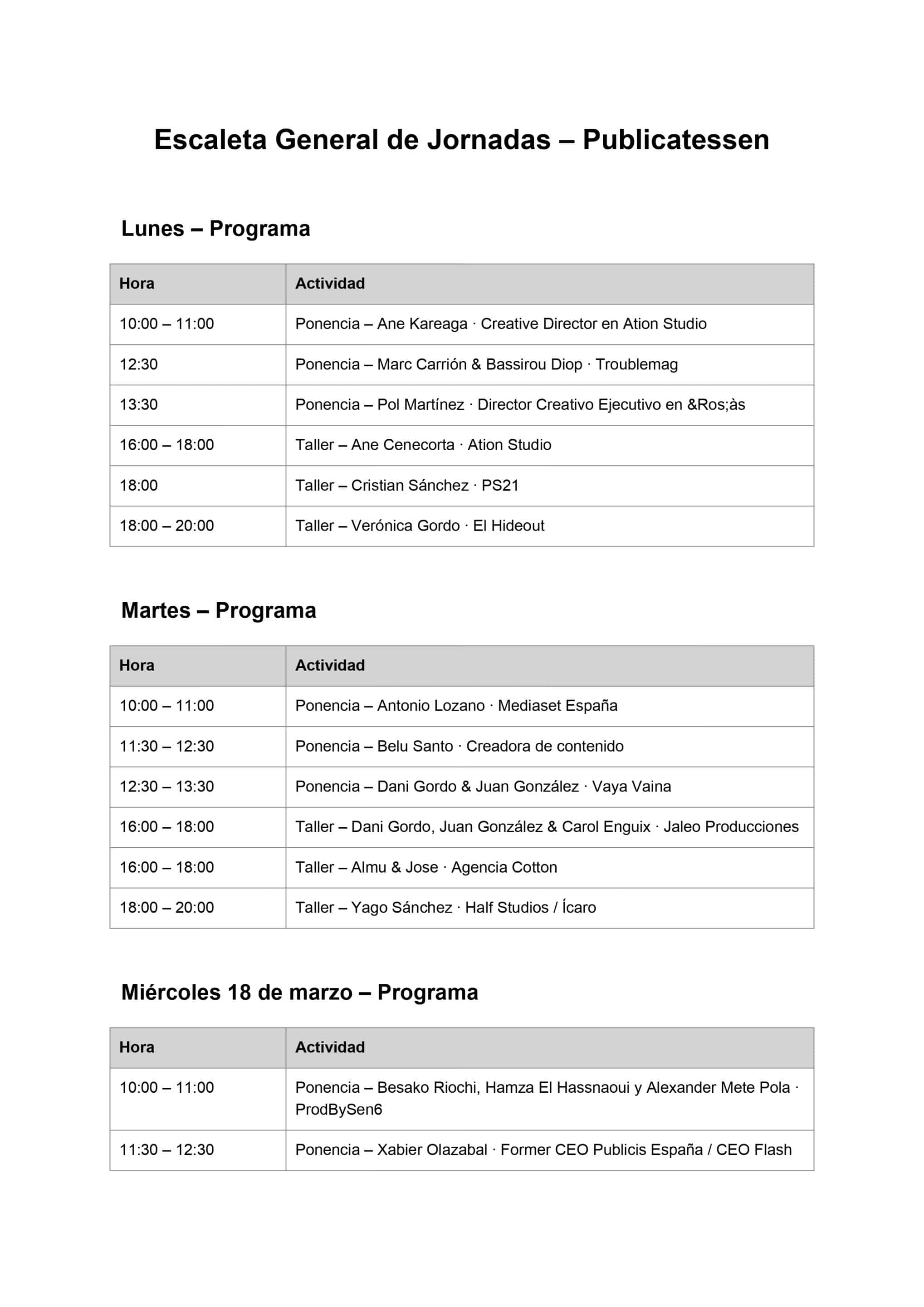 Tras la inauguración se dará comienzo a las 10 horas con la primera ponencia del programa, a cargo de Ane Kareaga, creative director en Ation Studio. Publicatessen se ha consolidado como uno de los festivales universitarios de referencia en el ámbito de la comunicación en España, creando un punto de encuentro entre estudiantes, profesionales y la industria creativa.